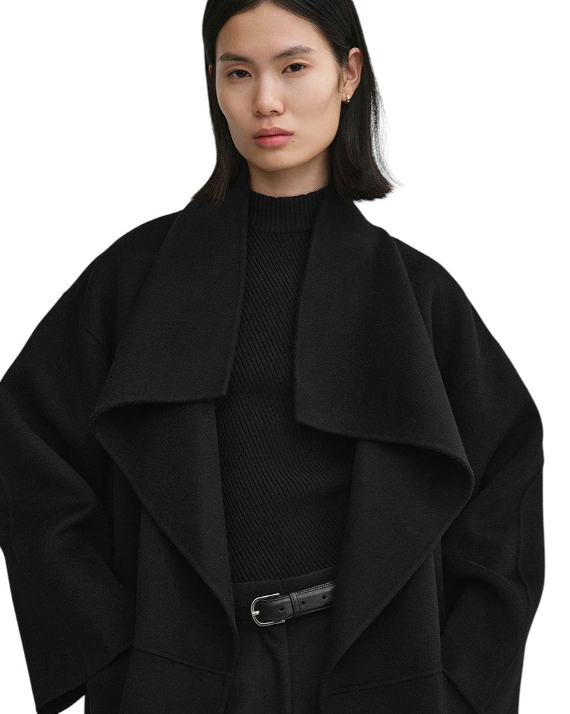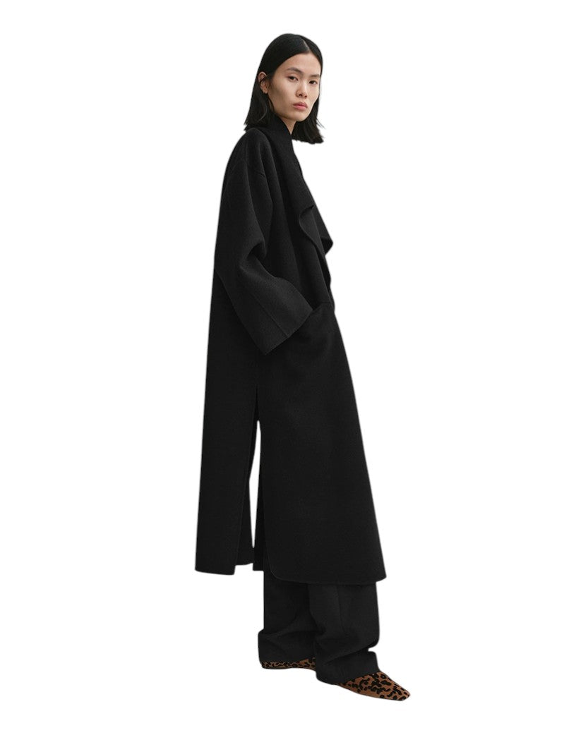 Фірмове пальто виготовлене з м'якої подвійної тканини TOTEME - суміші вовни та кашеміру з відповідального виробництва, яка створюється шляхом ручного зшивання двох тонких шарів для отримання двосторонньої обробки з чистими швами. Силует оверсайз з легкими в стилізації шалевими лацканами, спущеними плечима і відкритим передом, що робить його ідеальним для багатошарового використання, доповнений вшитими кишенями і боковими розрізами.