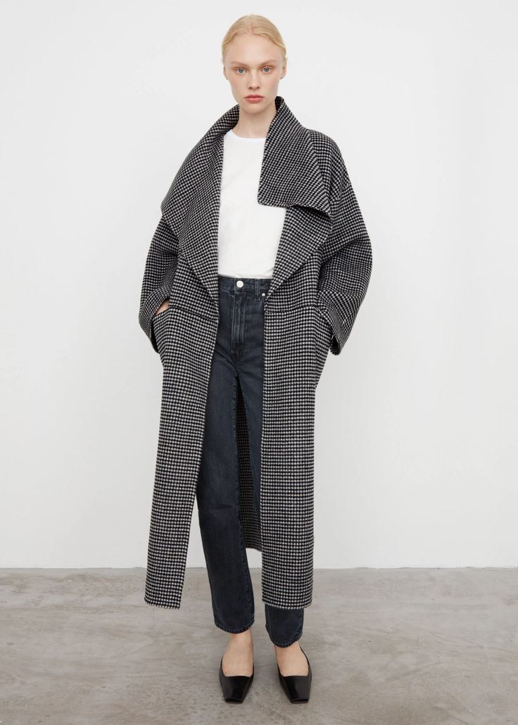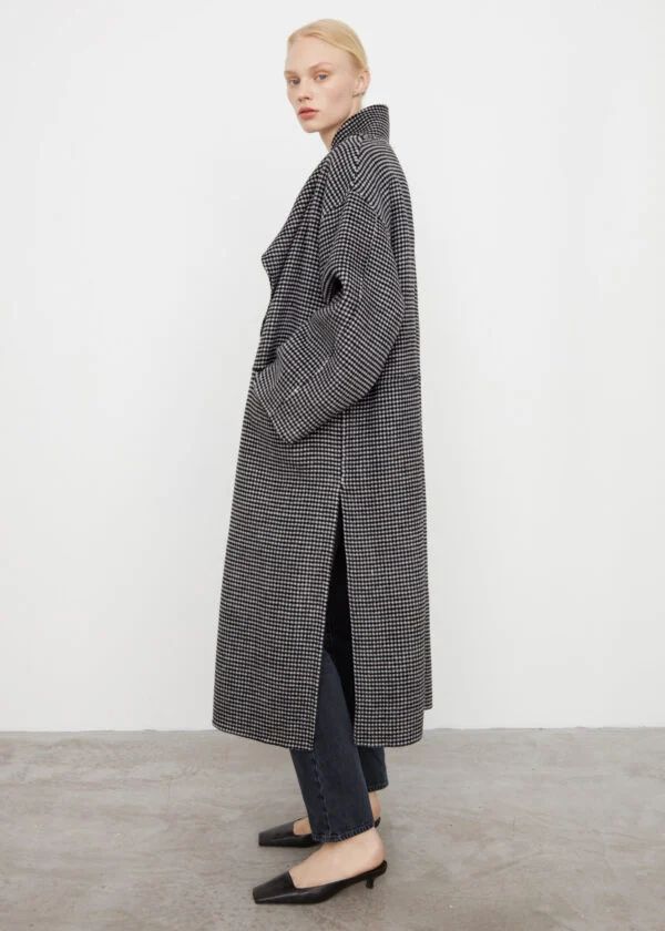 Поєднання чорного і білого ворсу створює ілюзію сірого кольору пальто Totême Annecy, що робить його легким верхнім одягом для класичних ансамблів. Воно виготовлене з розкішної суміші вовни та кашеміру з широкими шалевими лацканами та потайними кишенями в швах, обрамленими широкими рукавами.