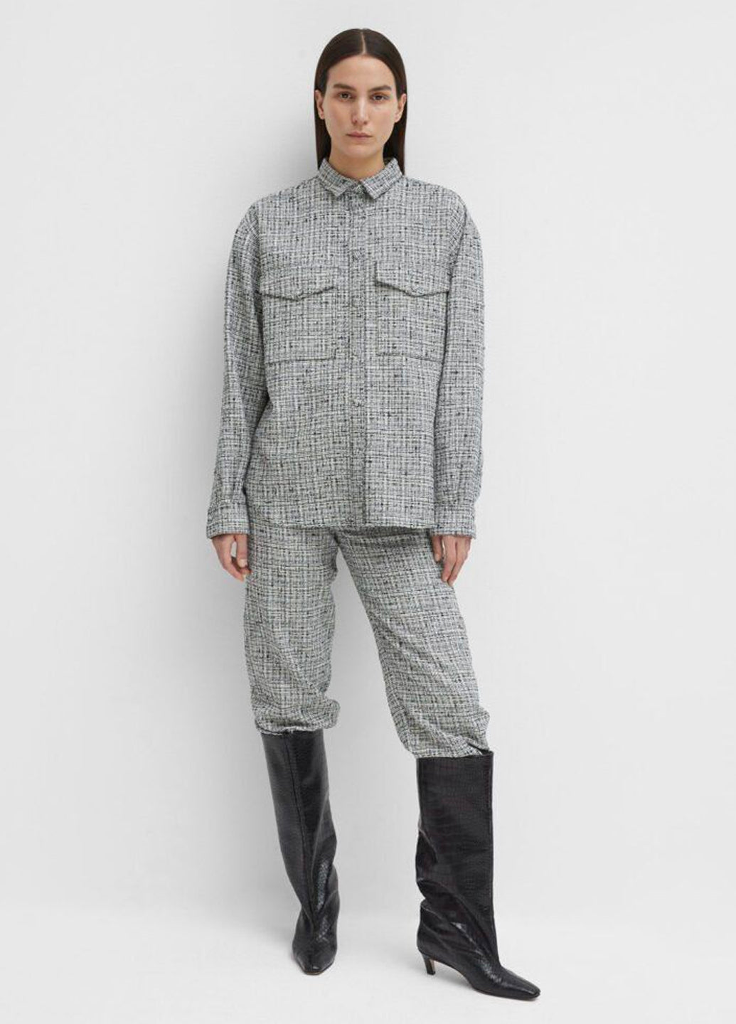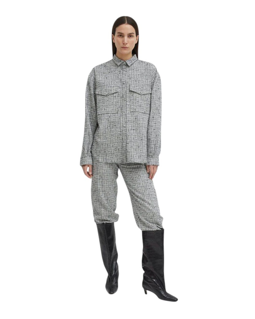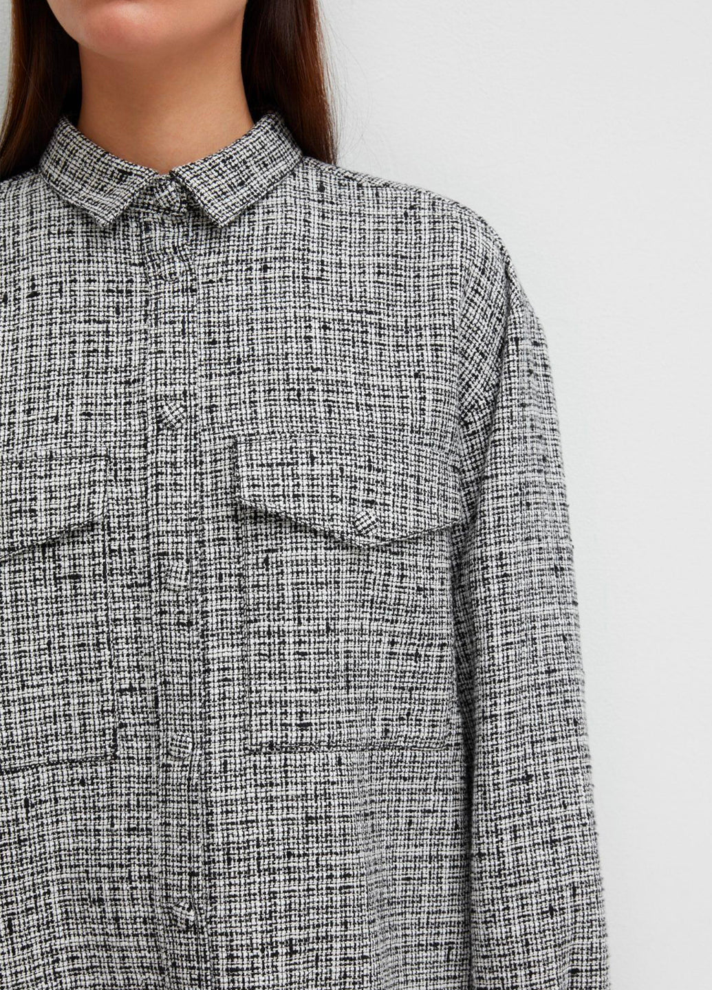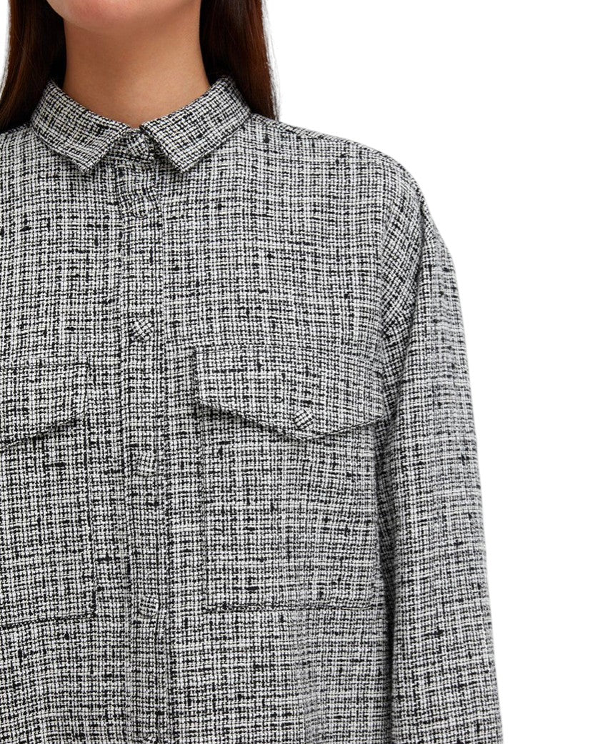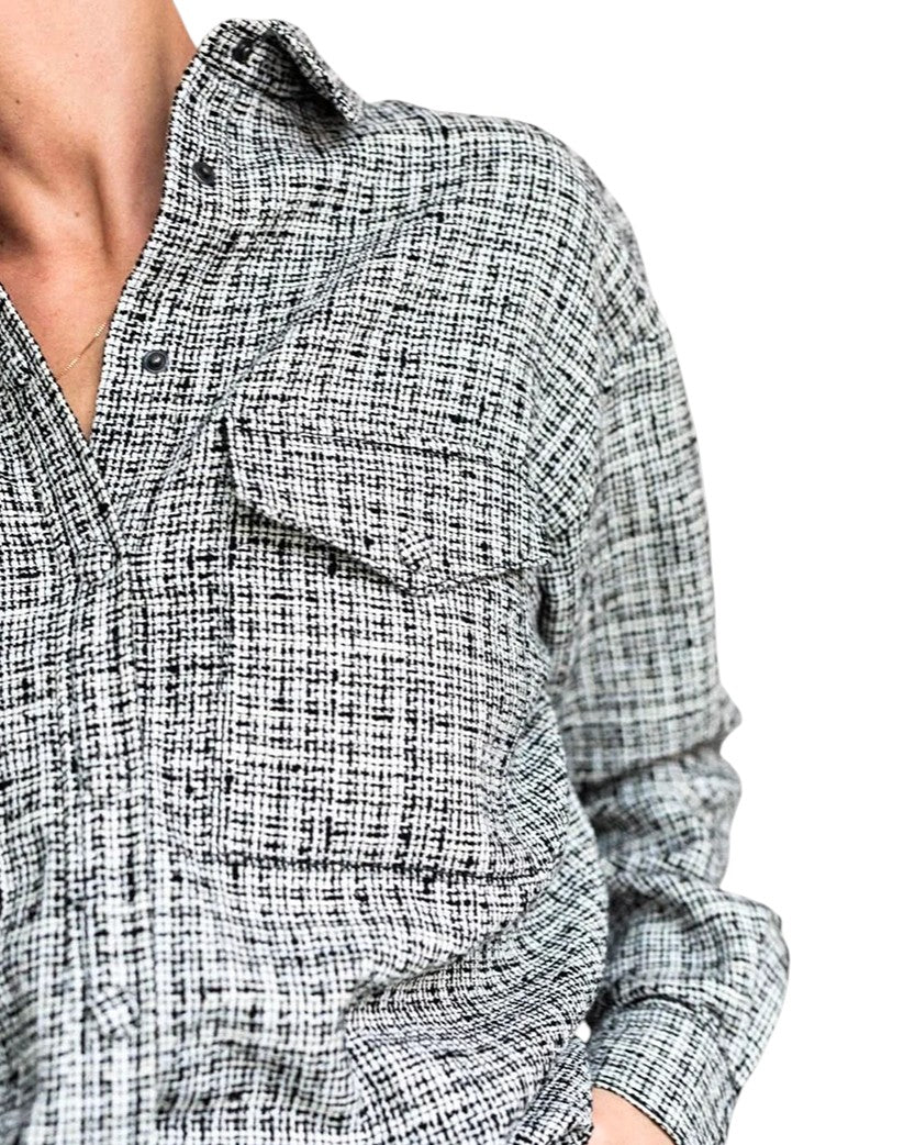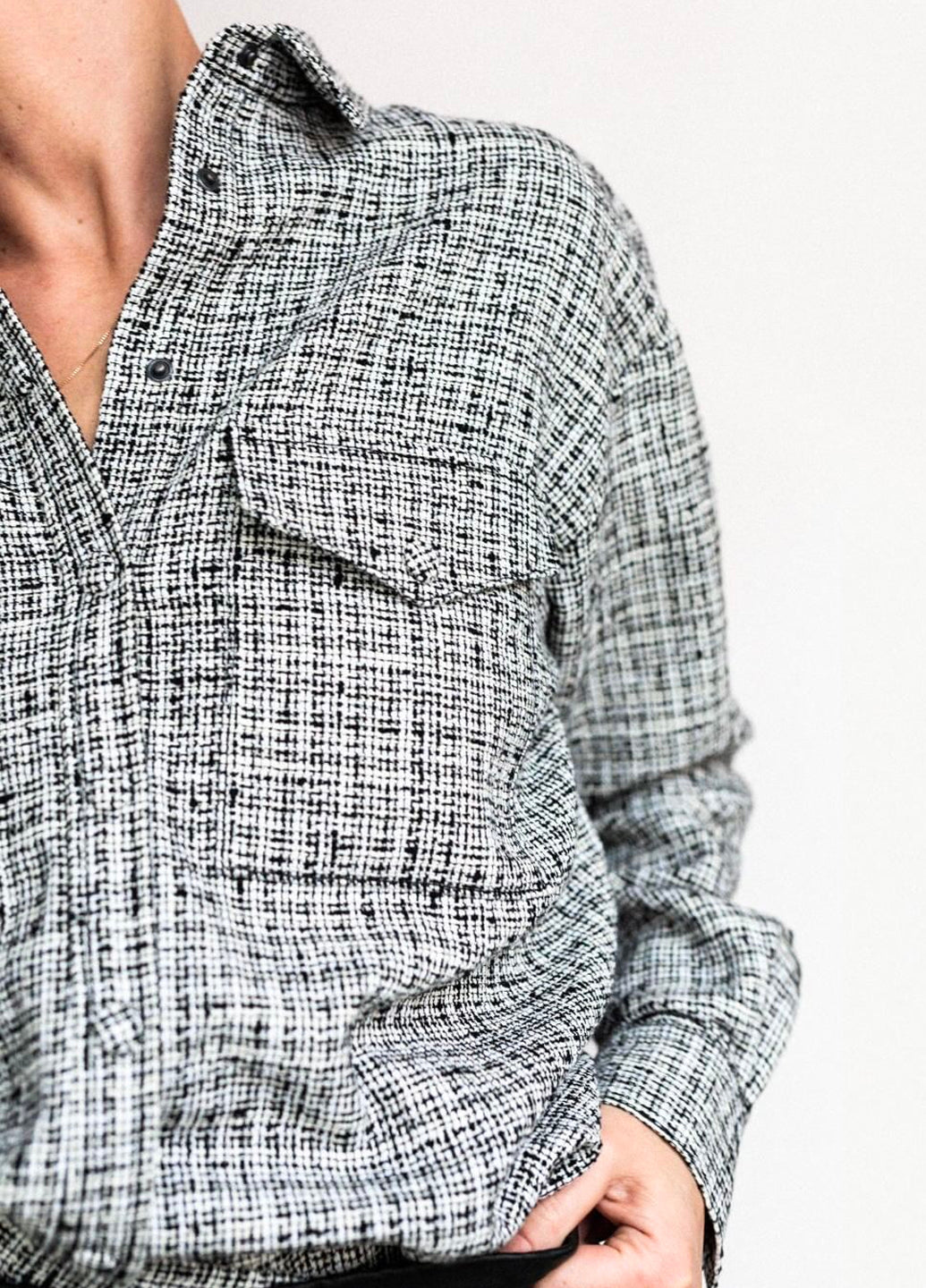 Твідова сорочка з бавовняного та лляного міксу з довгим рукавом у чорно-білій гамі пропонує елегантний стиль і зручність. Застібка на ґудзики спереду та кишені з клапанами на грудях додають практичності. Манжети на одному ґудзику завершують цей класичний, але стильний вигляд.