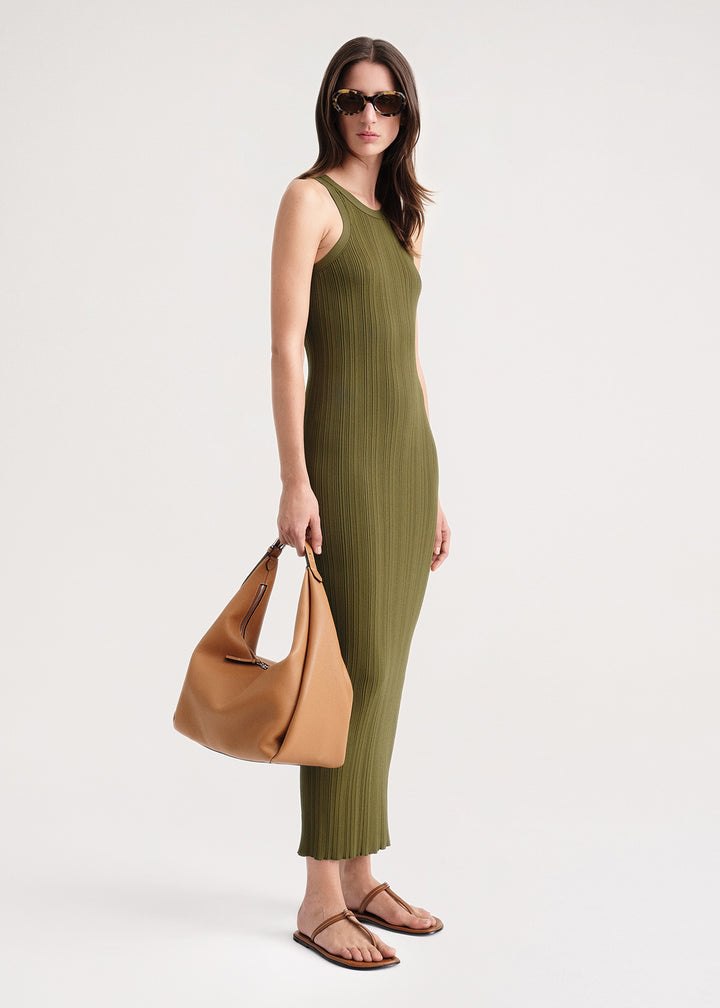 Ребриста сукня TOTEME, виготовлена з віскозної та переробленої поліамідної пряжі, має безшовний стрункий силует. Сукня має круглий виріз горловини і вигнуті пройми, що акцентують увагу на плечах, а потім спадає до щиколотки. Влітку поєднуйте її з босоніжками та кросівками.