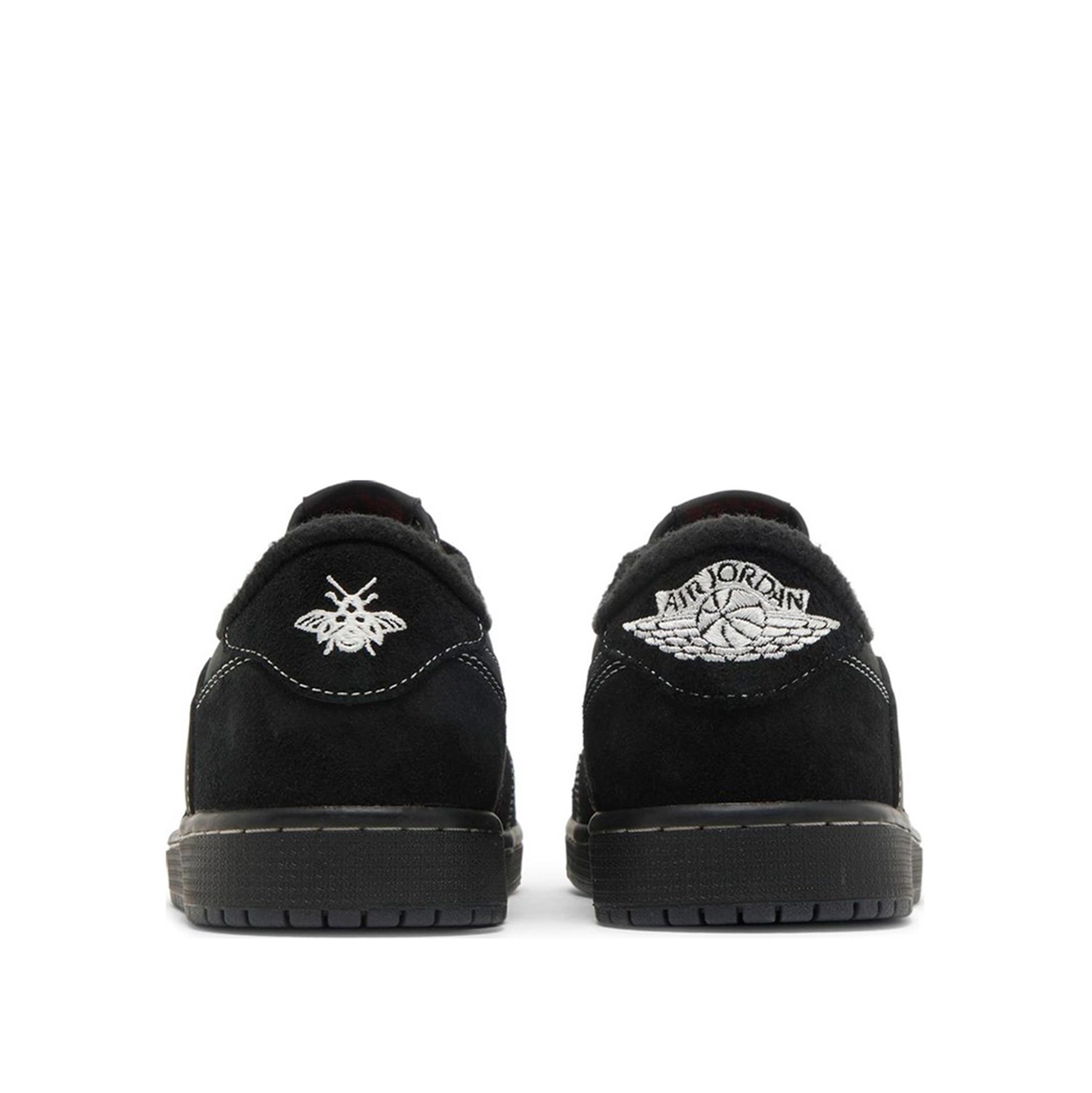 Кросівки Travis Scott x Air Jordan 1 Low OG SP PS 'Black Phantom', поєднують в собі елегантну обробку з фірмовими штрихами La Flame. Низькі кросівки мають повністю чорний верх з нубуку та замші з контрастними білими швами. Задній край прикрашає логотип Swoosh Скотта, а язички прикрашають плетені ярлики Nike. Невідповідні п'яткові вкладки відображають логотип Jordan Wings на правому кросівку та графічний малюнок бджіл на лівому. Основу кросівок складає чорна гумова підошва з прошитою конструкцією боковин.