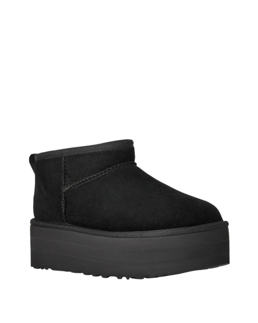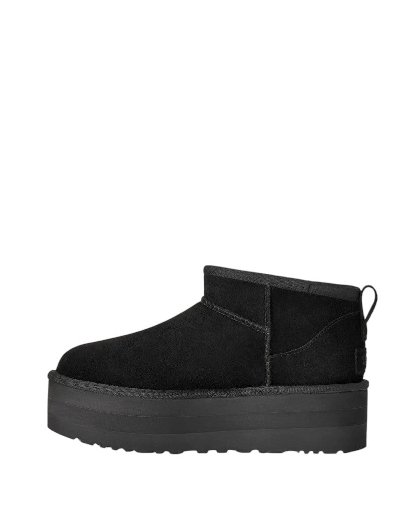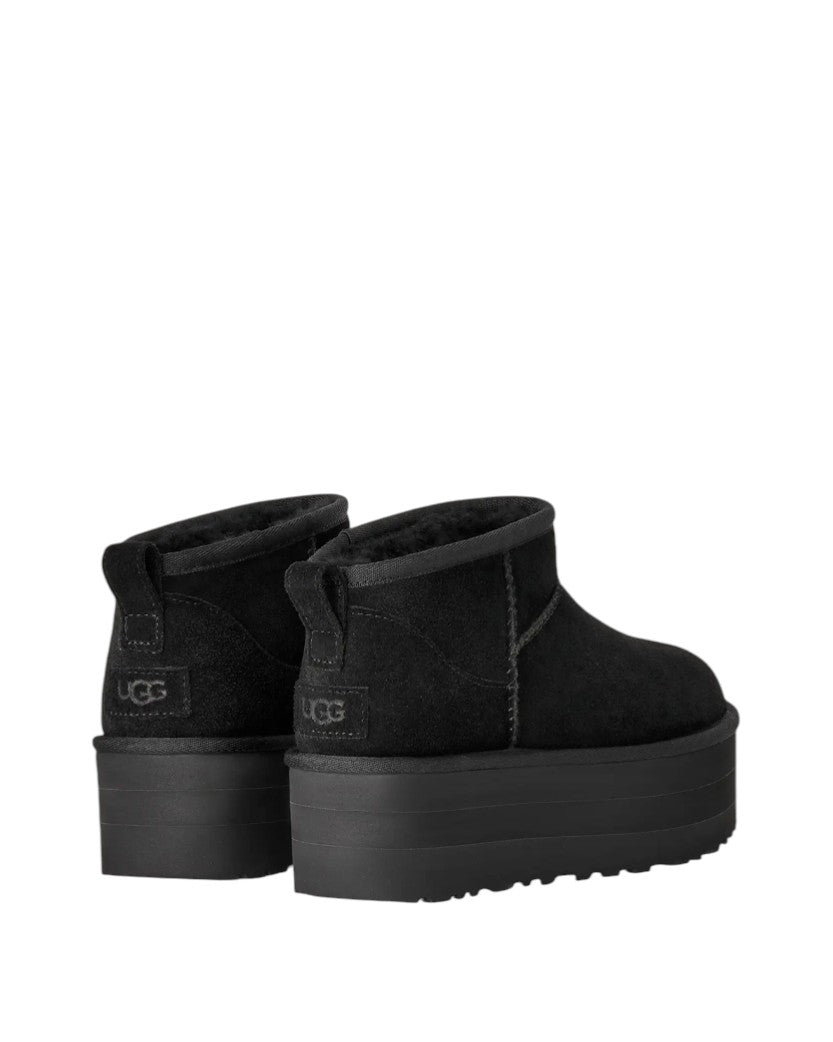 Чорні черевики 'Classic Ultra Mini Platform' від UGG. Ця модель, виготовлена зі шкіри Twinface, має нашивку з логотипом на заднику, текстильну палітурку зі 100% перероблених поліефірних волокон, устілку UGGplush™ та чорну підошву з пінополіуретану Treadlite by UGG™ EVA.