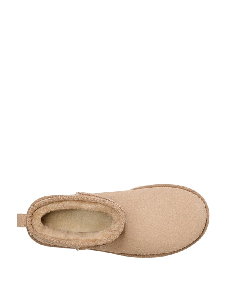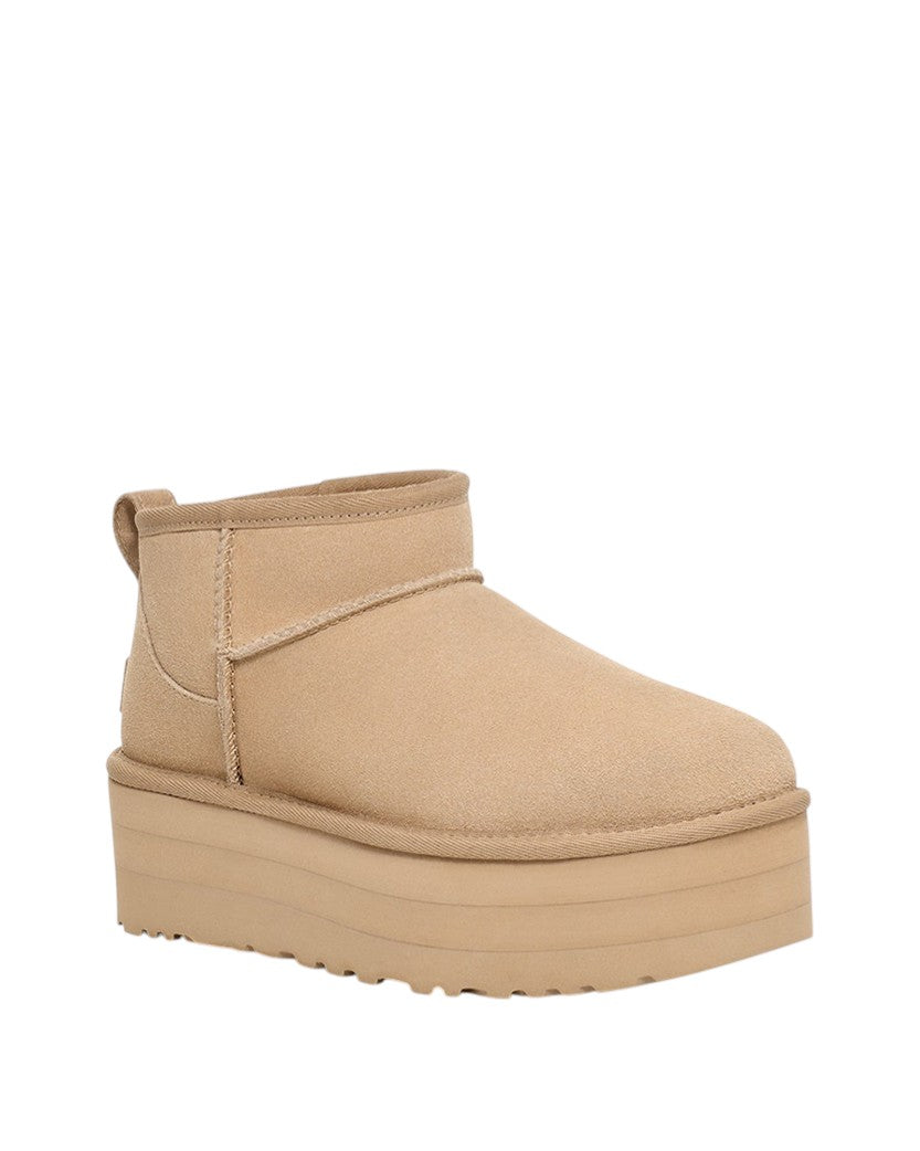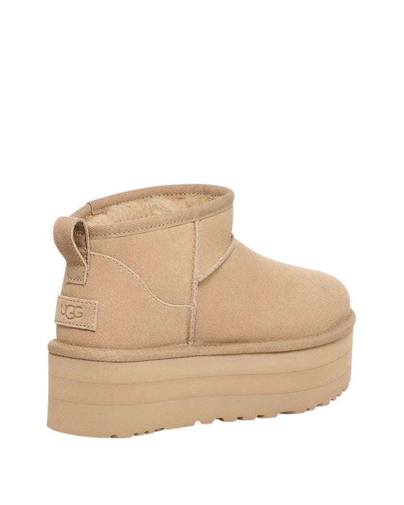 Бежеві черевики 'Classic Ultra Mini Platform' від UGG. Ця модель, виготовлена зі шкіри Twinface, має нашивку з логотипом на заднику, текстильну палітурку зі 100% перероблених поліефірних волокон, устілку UGGplush™ та підошву в тон з пінополіуретану Treadlite by UGG™ EVA.