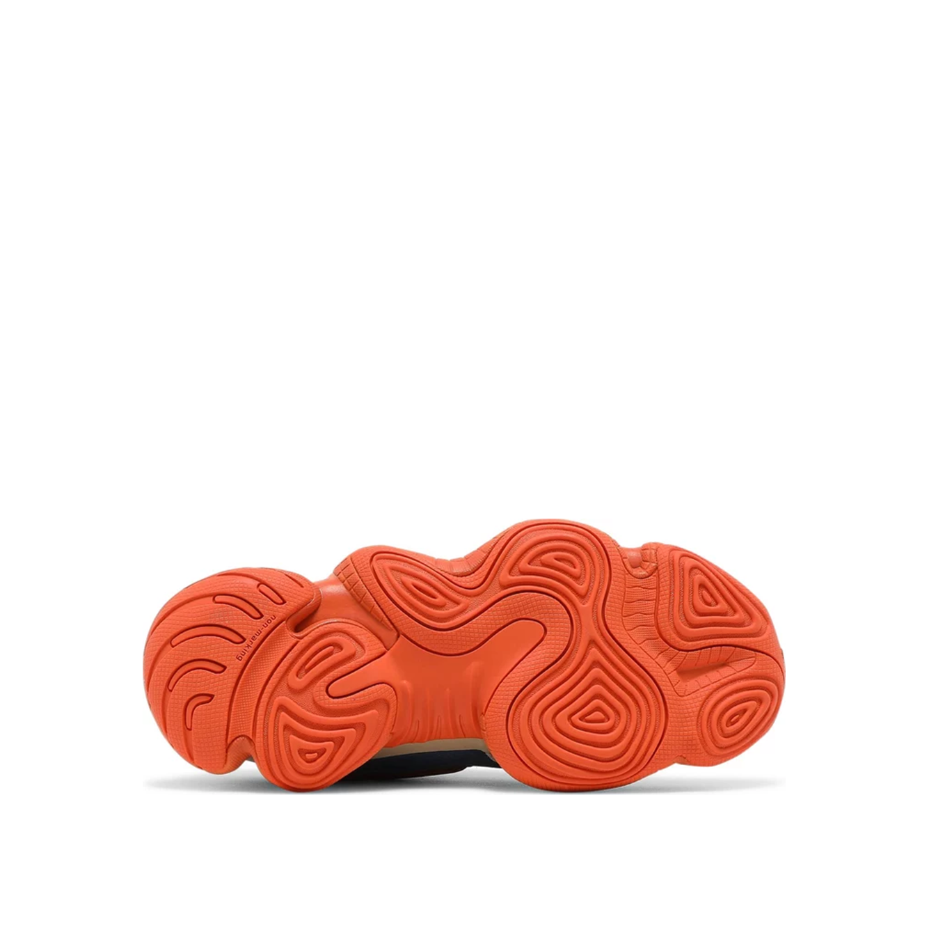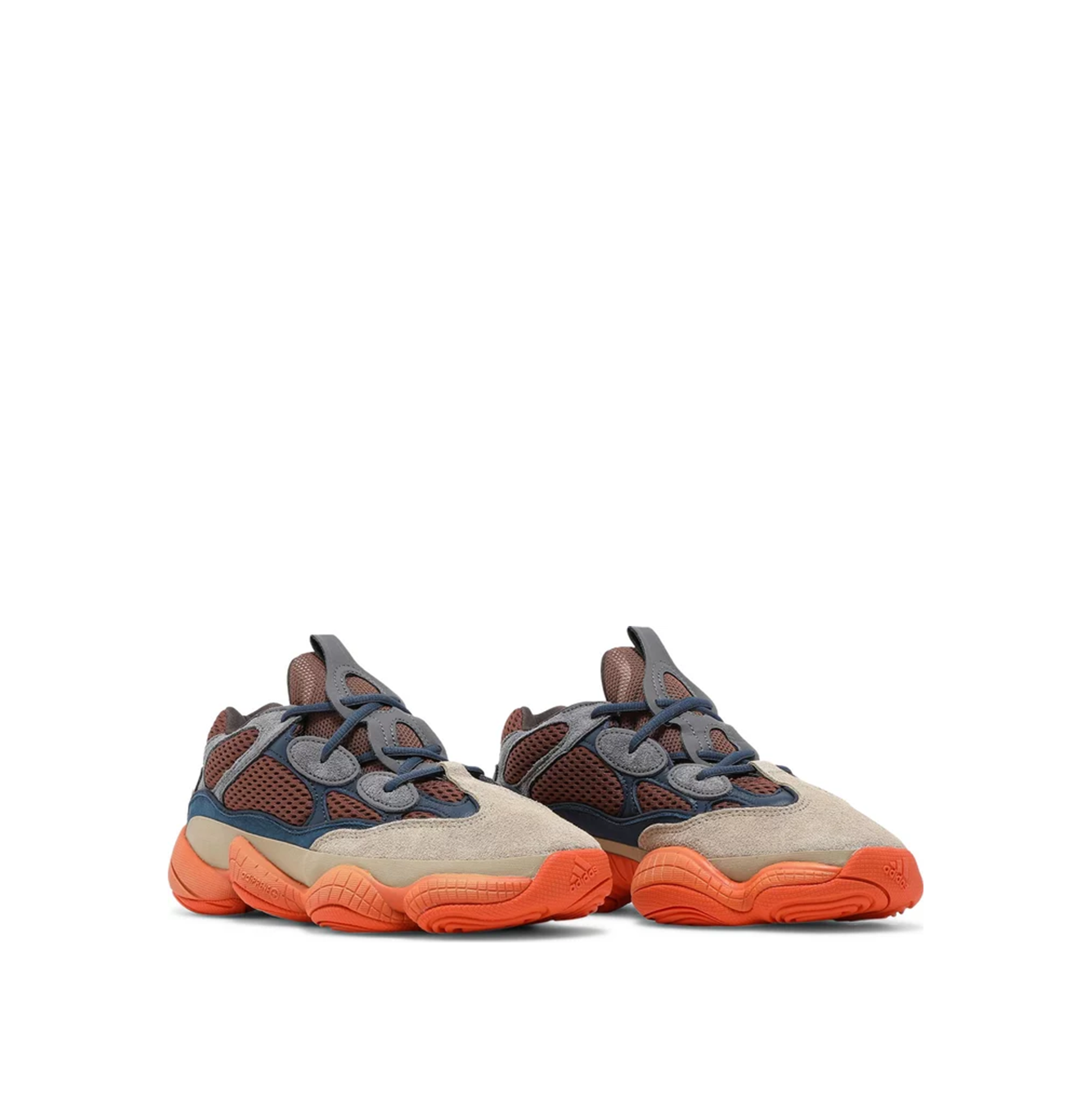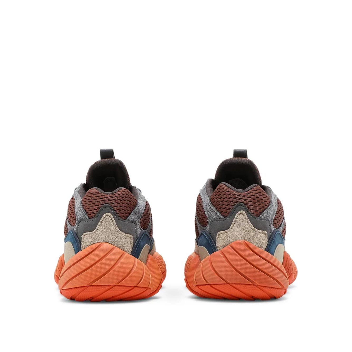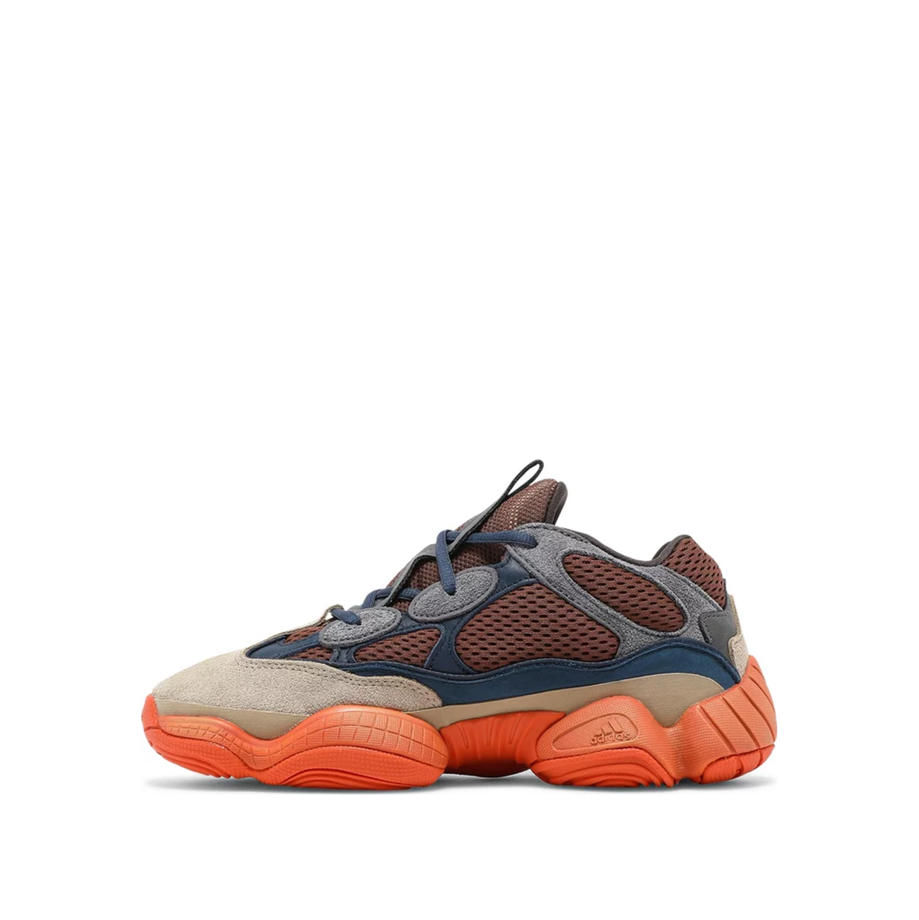 Adidas Yeezy 500 Enflame підкреслює технологію adiPRENE+ з яскраво-помаранчевим покриттям. Пропонуючи поєднання поглинання ударів та чуйної амортизації, модульна підошва безпосередньо натхненна adidas KB8 3, випущеними в 1999 році як третій фірмовий кросівок Кобі Брайанта. У верхній частині кросівок складна конструкція поєднує коричневу відкриту сітку з м'якими замшевими накладками коричневого, сірого та індиго. Гумова підошва забезпечує додаткову міцність і підтримку.